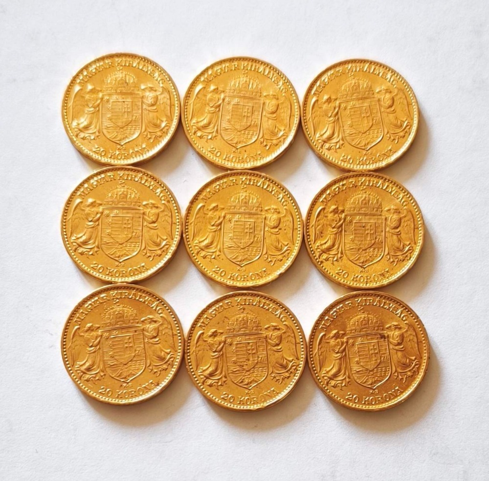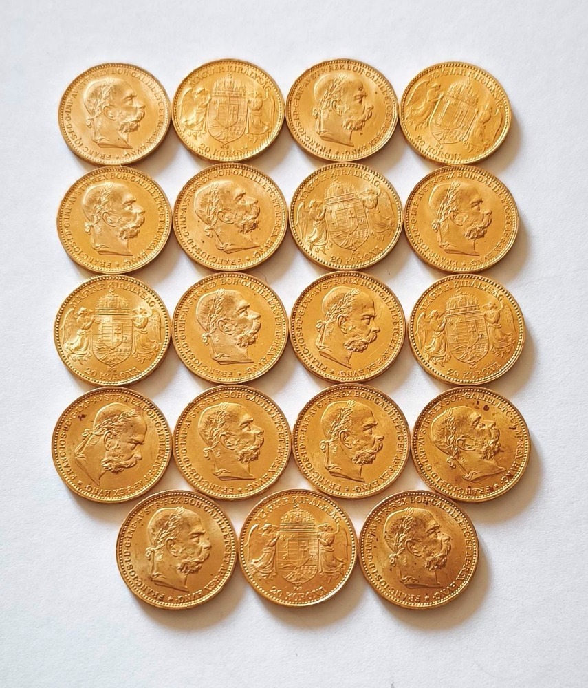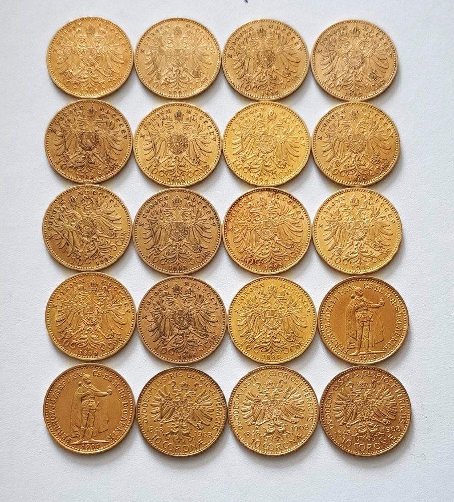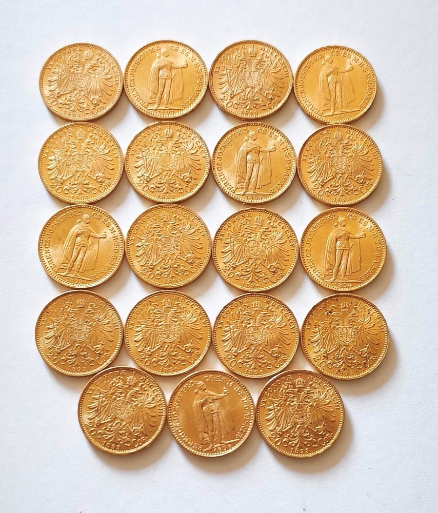 Zlaté 20 koruny BZ+KB různé ročníky – Au 900, váha 6.78 g. průměr 21 mm