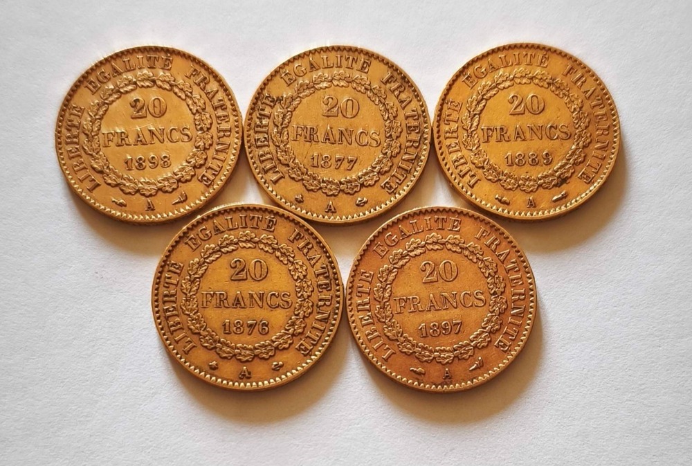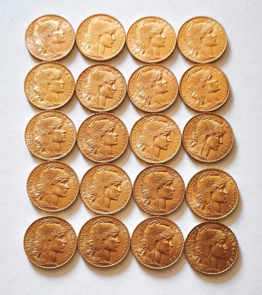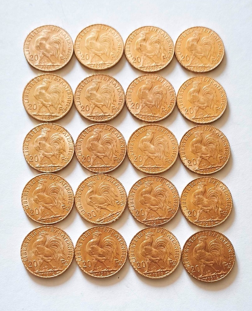 20 franky – kohouti – různé ročníky Au 900,váha 6.45 g ,průměr 21 mm