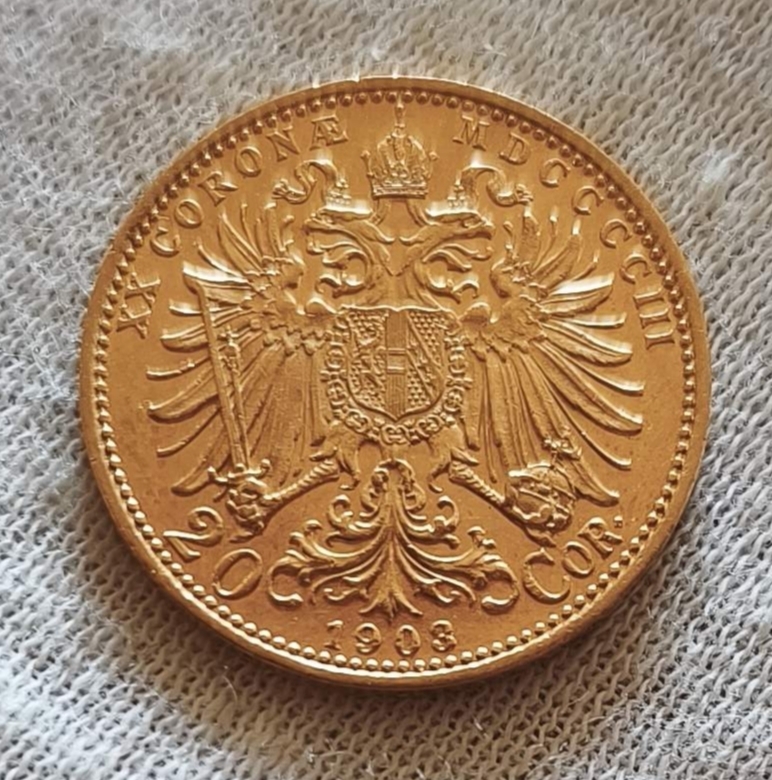 Zlatá 20 koruna 1903 BZ hledanější – Au 900,váha 6.78 g ,průměr 21 mm