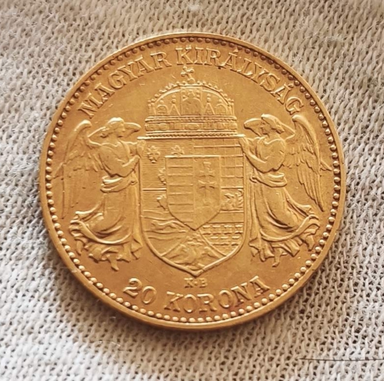 Vzácnější 20 koruny 1915 KB – Uhersko Au 900, váha 6.78 g. průměr 21 mm