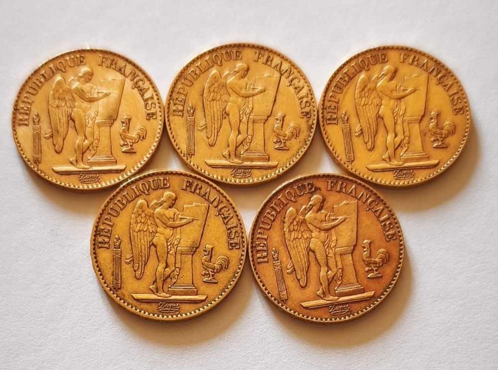 20 franky Anděl – hledanější – Au 900, váha 6.45 g. průměr 21 mm